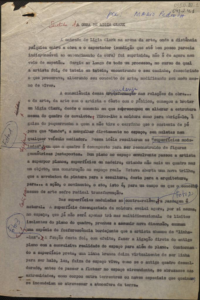 Onde quero destacar ainda o texto-crítico escrito por Mário Pedrosa da mesma data, sobre a mudança das relações entre obra de arte, artista e público reveladas pelo trabalho de Lygia Clark. Faz ainda, referência à relação existente entre a artista e o movimento cinético representado por Victor Vasarely, Agan e outros nomes com Alexander Calder. Esse último em exposição atualmente no Instituto Casa Roberto Marinho.